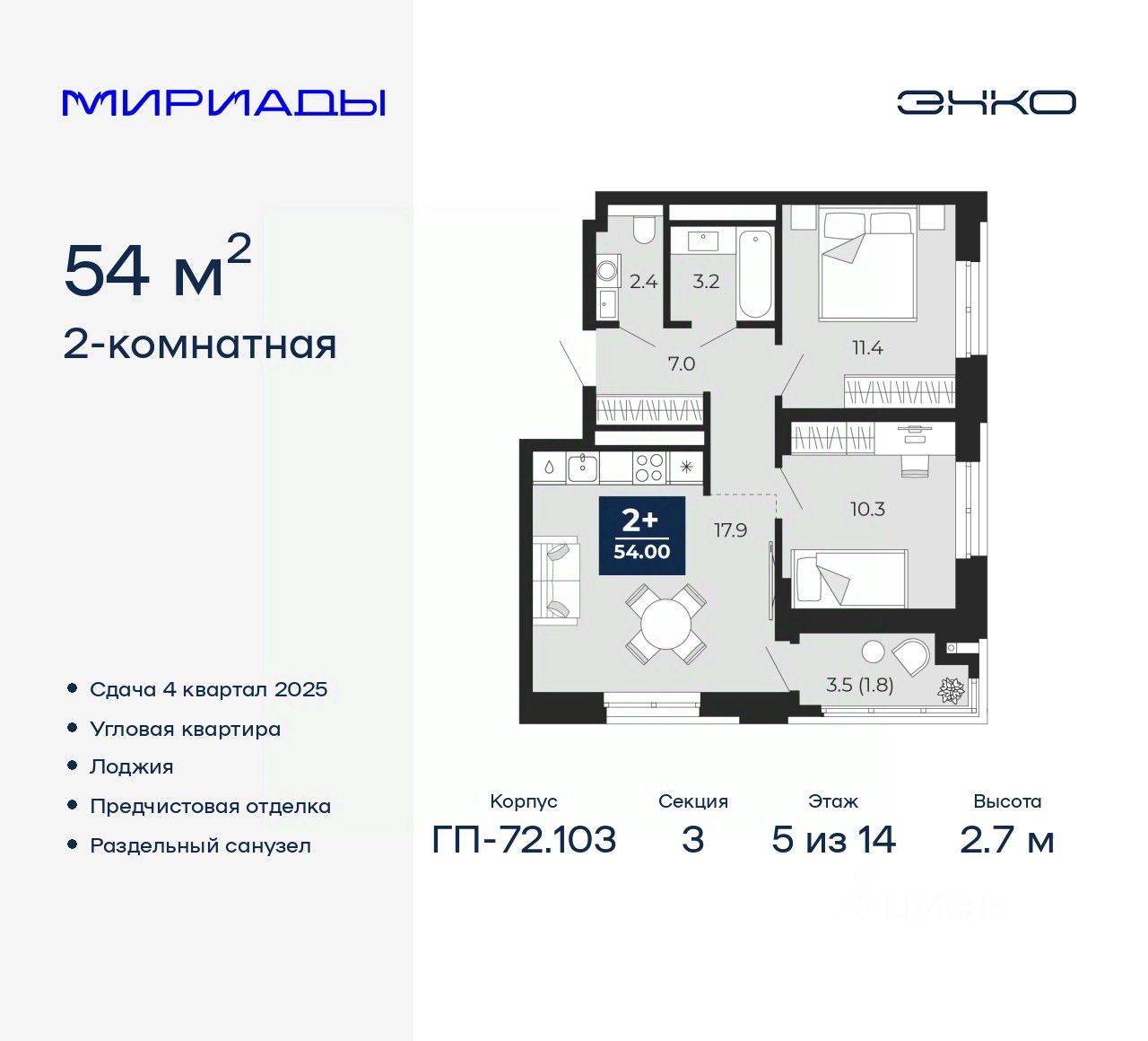 Продается 2-комн. квартира от застройщика с предчистовой отделкой в ЖК "Мириады" на 5 этаже. Общая площадь: 54 кв.м., жилая: 21.7 кв.м., площадь просторной кухни-столовой: 17.9 кв.м. Угловая квартира, идеально подойдет любителям тишины и панорамных видов. В квартире одна лоджия, один раздельный санузел. Высота потолков 2.7 м.
