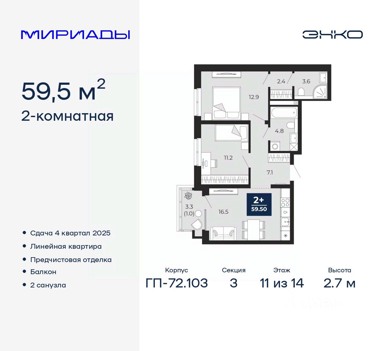 Просторная 2-комн. квартира с предчистовой отделкой в ЖК "Мириады" на 11 этаже. Общая площадь: 59.5 кв.м., жилая: 24.1 кв.м., площадь просторной кухни-столовой: 16.5 кв.м. Комнаты изолированные, все окна выходят на одну сторону. В квартире один балкон, два совмещенных санузла. Высота потолков 2.7 м.