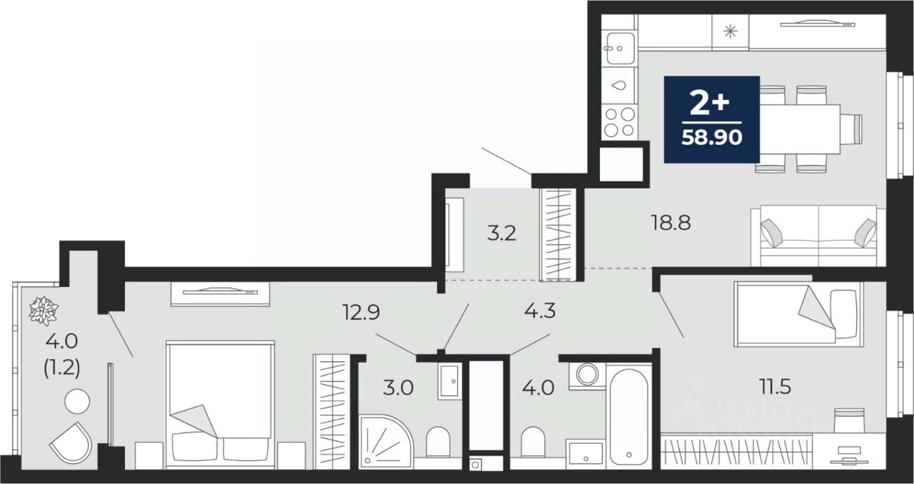 Продается 2-комн. квартира с предчистовой отделкой в ЖК "Мириады" на 9 этаже. Общая площадь: 58.9 кв.м., жилая: 24.4 кв.м., площадь просторной кухни-столовой: 18.8 кв.м. Квартира - распашонка, без проходных комнат, окна выходят на paзные стороны дома. В квартире один балкон, два совмещенных санузла. Высота потолков 2.7 м.