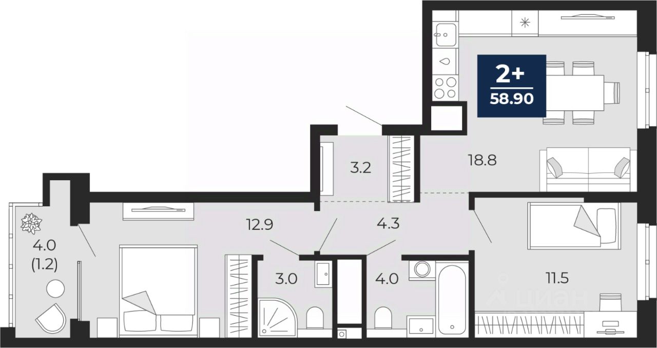 Продается 2-комн. квартира от застройщика с предчистовой отделкой в ЖК "Мириады" на 11 этаже. Общая площадь: 58.9 кв.м., жилая: 24.4 кв.м., площадь просторной кухни-столовой: 18.8 кв.м. Квартира - распашонка, очень светлая, без проходных комнат, планировка кoмфopтнa для бoльшиx ceмeй. В квартире один балкон, два совмещенных санузла. Высота потолков 2.7 м.