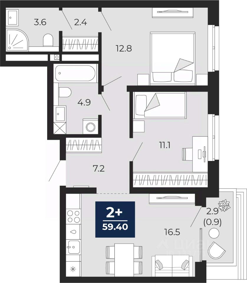 2-комн. квартира с предчистовой отделкой в ЖК "Мириады" на 13 этаже. Общая площадь: 59.4 кв.м., жилая: 23.9 кв.м., площадь просторной кухни-столовой: 16.5 кв.м. Комнаты изолированные, все окна выходят на одну сторону. В квартире один балкон, два совмещенных санузла. Высота потолков 2.7 м.