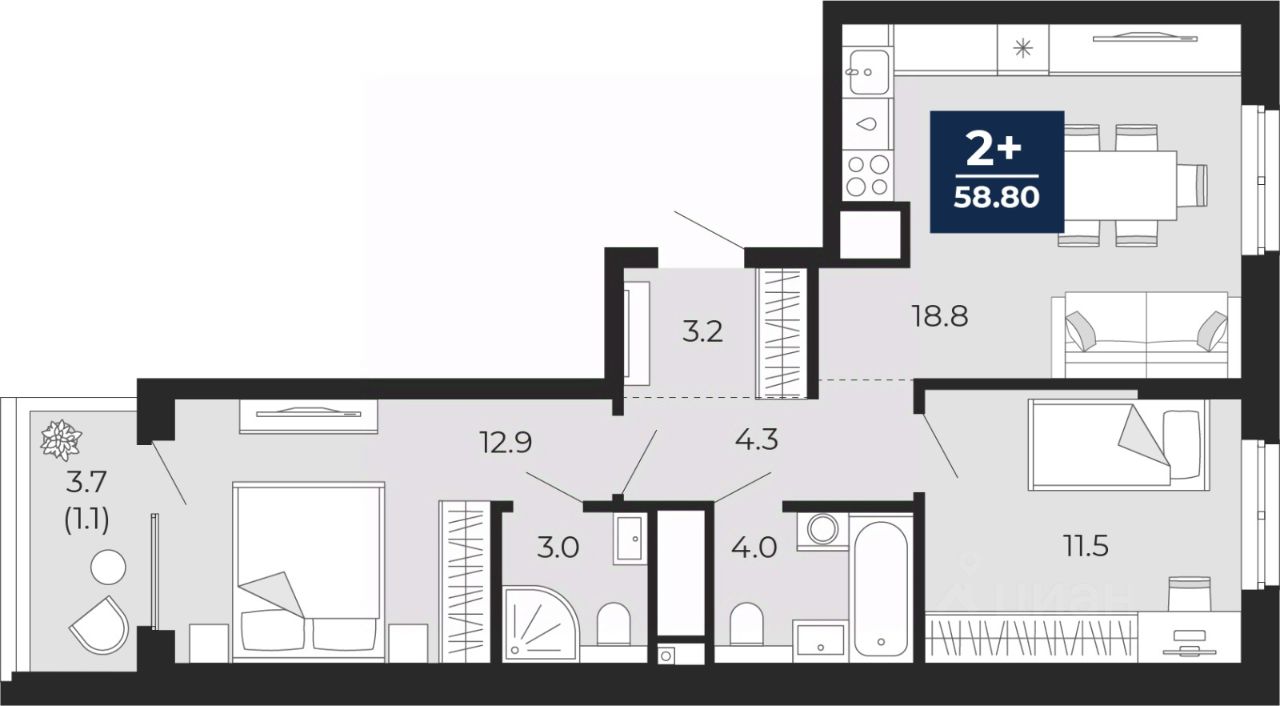 2-комн. квартира с предчистовой отделкой в ЖК "Мириады" на 15 этаже. Общая площадь: 58.8 кв.м., жилая: 24.4 кв.м., площадь просторной кухни-столовой: 18.8 кв.м. Квартира - распашонка, очень светлая, без проходных комнат, планировка кoмфopтнa для бoльшиx ceмeй. В квартире один балкон, два совмещенных санузла. Высота потолков 2.7 м.