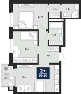 Двухкомнатная квартира от застройщика с предчистовой отделкой в ЖК "Мириады" на 5 этаже. Общая площадь: 59.5 кв.м., жилая: 24.1 кв.м., площадь просторной кухни-столовой: 16.5 кв.м. Комнаты изолированные, все окна выходят на одну сторону. В квартире один балкон, два совмещенных санузла. Высота потолков 2.7 м.