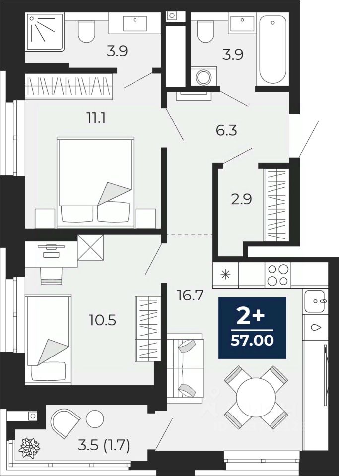 Двухкомнатная квартира с предчистовой отделкой в ЖК "Мириады" на 8 этаже. Общая площадь: 57 кв.м., жилая: 21.6 кв.м., площадь просторной кухни-столовой: 16.7 кв.м. Угловая квартира, идеально подойдет любителям тишины и панорамных видов. В квартире одна лоджия, один совмещенный санузел. Высота потолков 2.7 м.