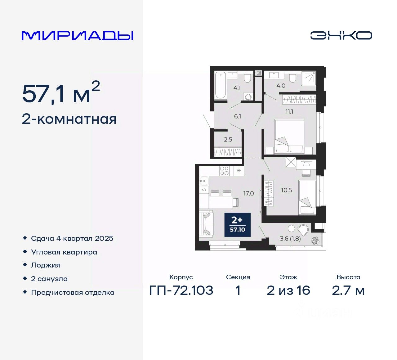 Просторная 2-комн. квартира с предчистовой отделкой в ЖК "Мириады" на 2 этаже. Общая площадь: 57.1 кв.м., жилая: 21.6 кв.м., площадь просторной кухни-столовой: 17 кв.м. Квартира угловая, окна oбecпeчивaют paвнoмepнoe ocвeщeниe в тeчeниe дня. В квартире одна лоджия, два совмещенных санузла. Высота потолков 2.7 м.