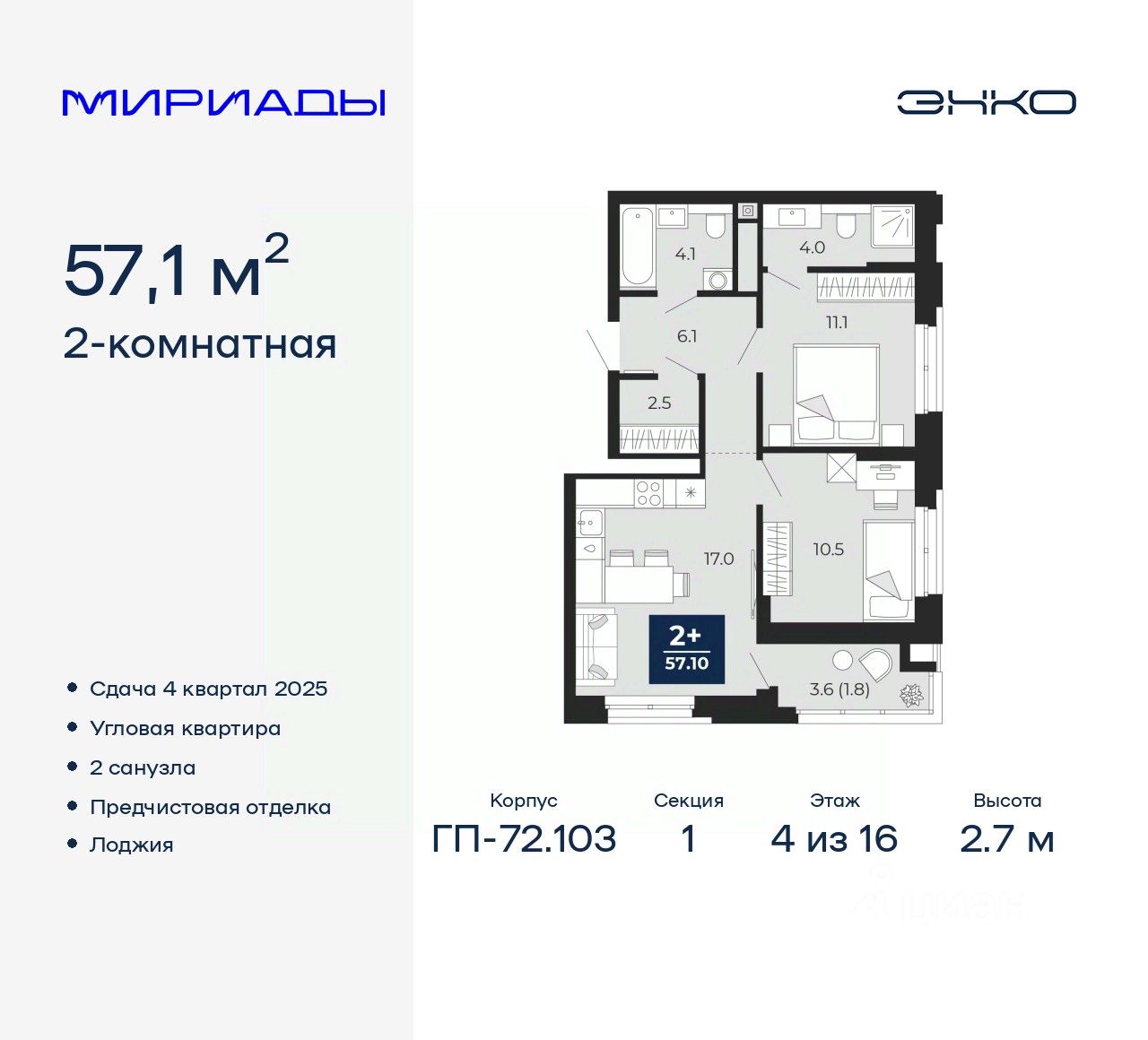 Просторная двухкомнатная квартира с предчистовой отделкой в ЖК "Мириады" на 4 этаже. Общая площадь: 57.1 кв.м., жилая: 21.6 кв.м., площадь просторной кухни-столовой: 17 кв.м. Угловая квартира, идеально подойдет любителям тишины и панорамных видов. В квартире одна лоджия, два совмещенных санузла. Высота потолков 2.7 м.