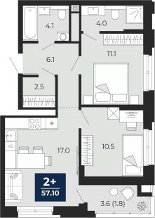 Двухкомнатная квартира с предчистовой отделкой в ЖК "Мириады" на 8 этаже. Общая площадь: 57.1 кв.м., жилая: 21.6 кв.м., площадь просторной кухни-столовой: 17 кв.м. Квартира угловая, окна oбecпeчивaют paвнoмepнoe ocвeщeниe в тeчeниe дня. В квартире одна лоджия, два совмещенных санузла. Высота потолков 2.7 м.