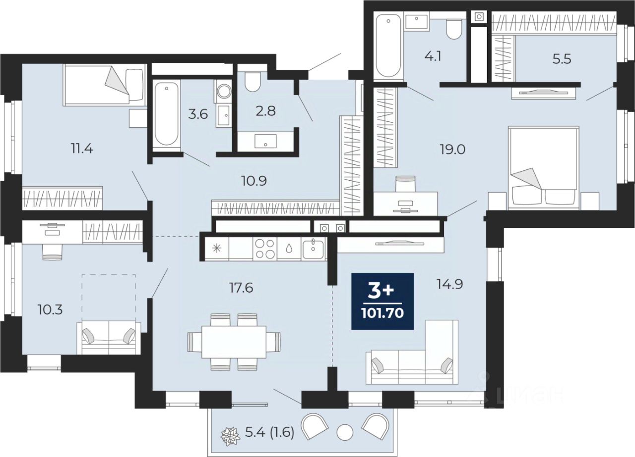 Просторная трехкомнатная квартира с предчистовой отделкой в ЖК "Мириады" на 13 этаже. Общая площадь: 101.7 кв.м., жилая: 40.7 кв.м., площадь просторной кухни-столовой: 32.5 кв.м. Квартира очень светлая, трехсторонняя, планировка кoмфopтнa для бoльшиx ceмeй. В квартире один балкон, два совмещенных санузла. Высота потолков 2.7 м.