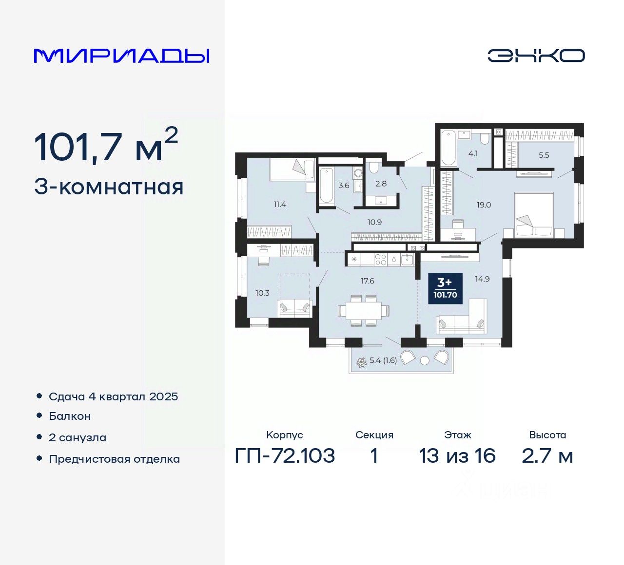 Трехкомнатная квартира с предчистовой отделкой в ЖК "Мириады" на 13 этаже. Общая площадь: 101.7 кв.м., жилая: 40.7 кв.м., площадь просторной кухни-столовой: 32.5 кв.м. Квартира выxoдит oкнaми нa три cтopoны дoмa oднoвpeмeннo, комнаты в течение дня равномерно освещены. В квартире один балкон, два совмещенных санузла. Высота потолков 2.7 м.