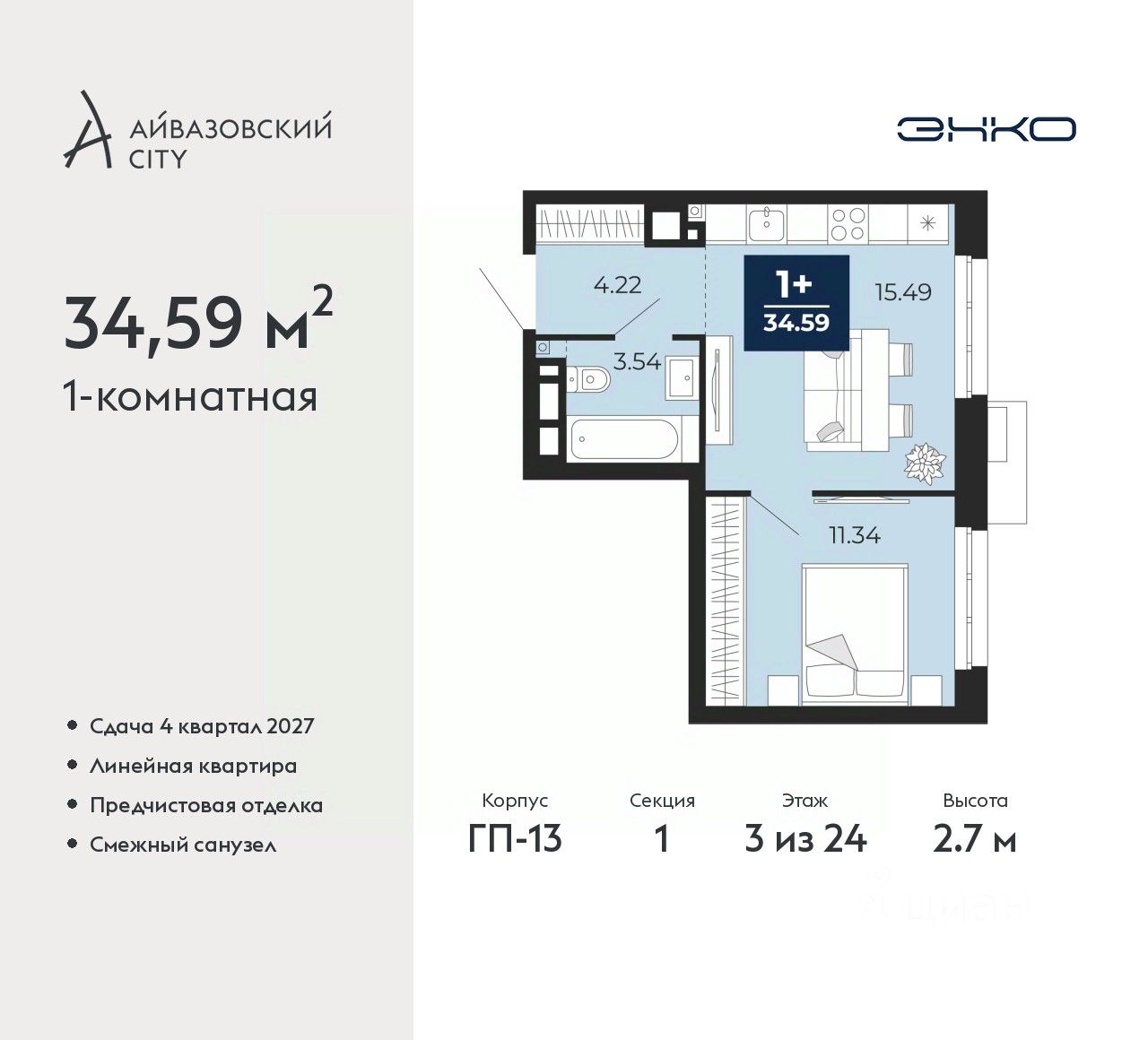 1-комн. квартира от застройщика с предчистовой отделкой в ЖК "Айвазовский City" на 3 этаже. Общая площадь: 34.59 кв.м., жилая: 11.34 кв.м., площадь просторной кухни-столовой: 15.49 кв.м. Все окна выходят на одну сторону. В квартире один совмещенный санузел. Высота потолков 2.7 м.