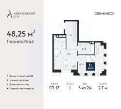 1-комн. квартира с предчистовой отделкой в ЖК "Айвазовский City" на 3 этаже. Общая площадь: 48.25 кв.м., жилая: 16.13 кв.м., площадь просторной кухни-столовой: 17.51 кв.м. Угловая квартира, очень светлая, естественная вентиляция при открытии окон. В квартире один совмещенный санузел. Высота потолков 2.7 м.