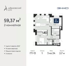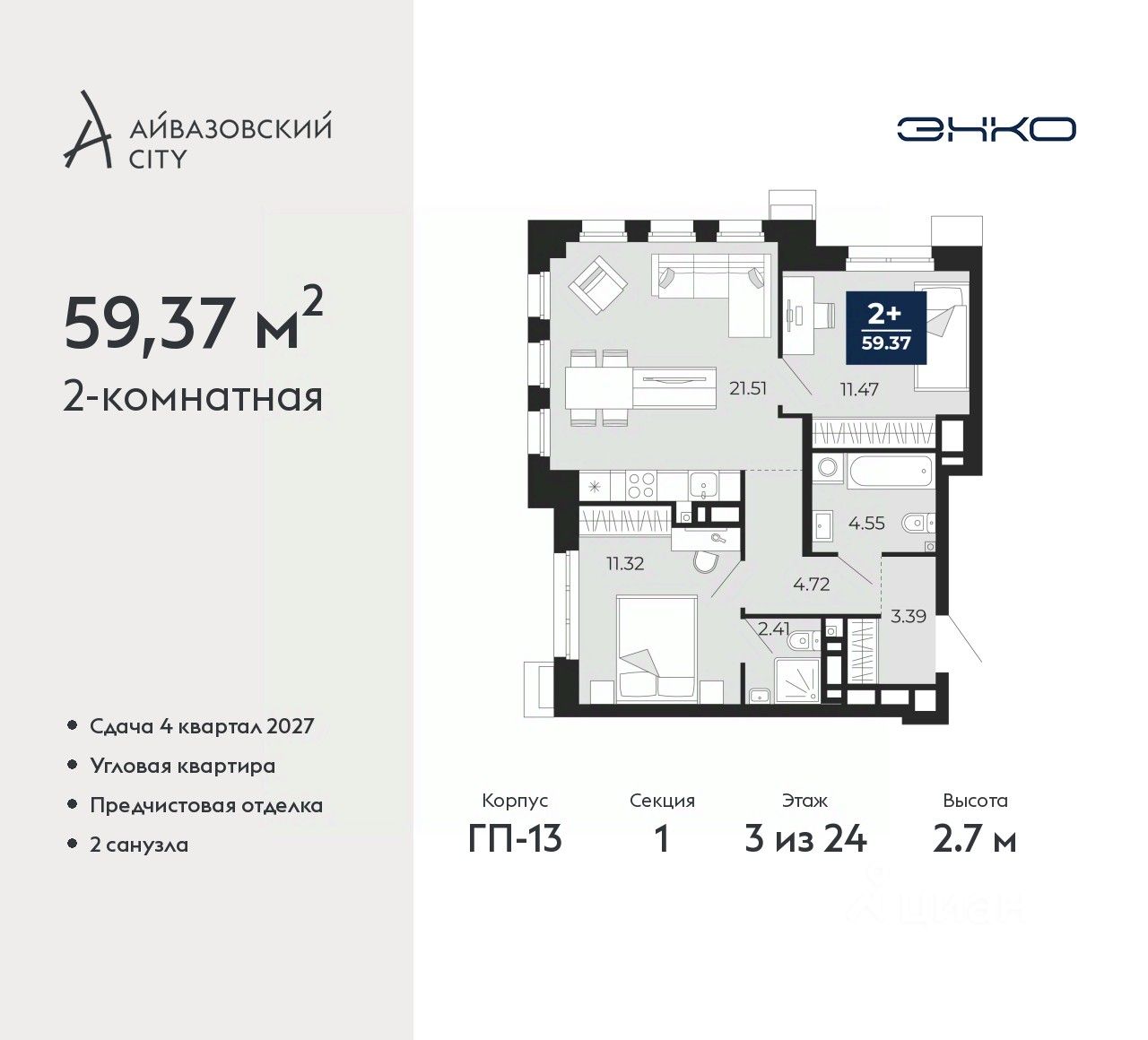 Просторная 2-комн. квартира с предчистовой отделкой в ЖК "Айвазовский City" на 3 этаже. Общая площадь: 59.37 кв.м., жилая: 22.79 кв.м., площадь просторной кухни-столовой: 21.51 кв.м. Квартира угловая, идеально подойдет любителям тишины и панорамных видов. В квартире два совмещенных санузла. Высота потолков 2.7 м.