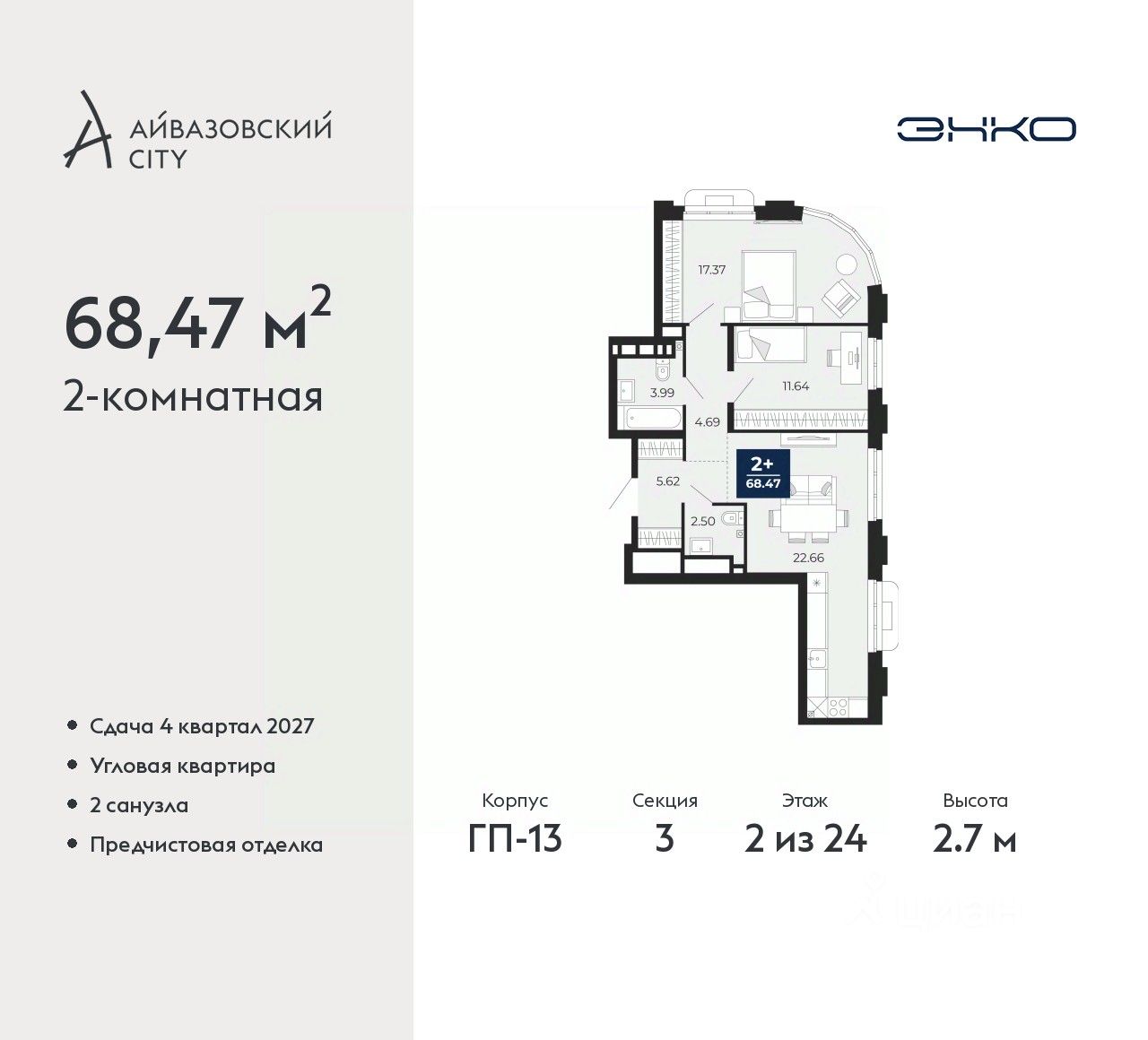 Продается 2-комн. квартира с предчистовой отделкой в ЖК "Айвазовский City" на 2 этаже. Общая площадь: 68.47 кв.м., жилая: 29.01 кв.м., площадь просторной кухни-столовой: 22.66 кв.м. Квартира угловая, идеально подойдет любителям тишины и панорамных видов. В квартире один совмещенный и один раздельный санузел. Высота потолков 2.7 м.