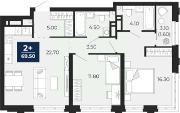 2-комн. квартира с предчистовой отделкой в ЖК "Айвазовский City" на 2 этаже. Общая площадь: 91.43 кв.м. Высота потолков 2.7 м.