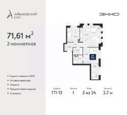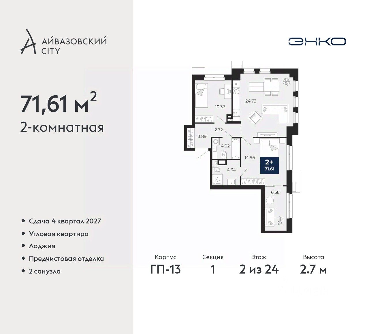 Просторная 2-комн. квартира с предчистовой отделкой в ЖК "Айвазовский City" на 2 этаже. Общая площадь: 71.61 кв.м., жилая: 25.33 кв.м., площадь просторной кухни-столовой: 24.73 кв.м. Квартира угловая, идеально подойдет любителям тишины и панорамных видов. В квартире одна лоджия, два совмещенных санузла. Высота потолков 2.7 м.