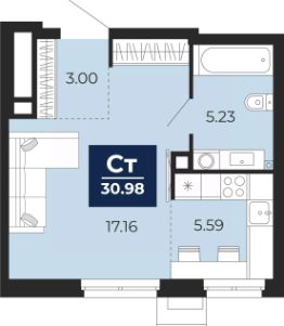 Просторная однокомнатная квартира-студия с предчистовой отделкой в ЖК "Айвазовский City" на 2 этаже. Общая площадь: 30.98 кв.м., площадь гостиной 22.75 кв.м., из которых 5.59 кв.м. выделено под кухонную зону. Все окна выходят на одну сторону. В квартире один совмещенный санузел. Высота потолков 2.7 м.