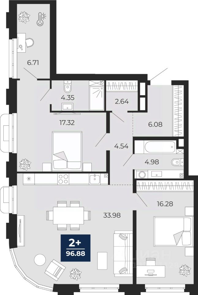 Двухкомнатная квартира с предчистовой отделкой в ЖК "Айвазовский City" на 2 этаже. Общая площадь: 96.88 кв.м. Высота потолков 2.7 м.
