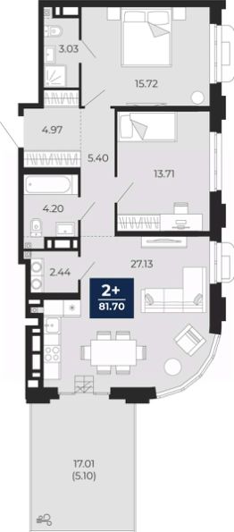 2-комн. квартира с предчистовой отделкой в ЖК "Айвазовский City" на 10 этаже. Общая площадь: 81.7 кв.м. Высота потолков 2.7 м.