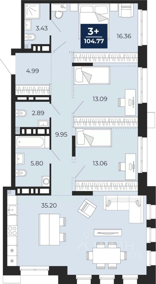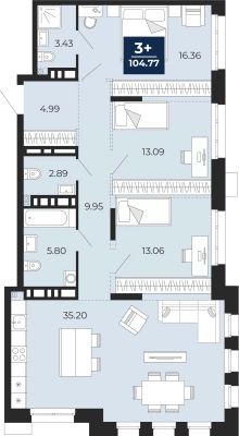 Трехкомнатная квартира с предчистовой отделкой в ЖК "Айвазовский City" на 3 этаже. Общая площадь: 104.77 кв.м. Высота потолков 2.7 м.
