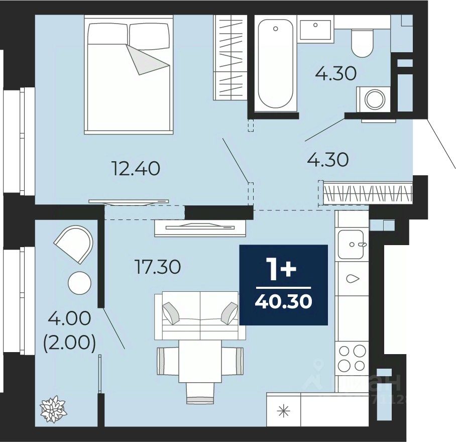 Продается однокомнатная квартира с предчистовой отделкой в ЖК "Айвазовский City" на 6 этаже. Общая площадь: 40.3 кв.м., жилая: 12.4 кв.м., площадь просторной кухни-столовой: 17.3 кв.м. Все окна выходят на одну сторону. В квартире одна лоджия, один совмещенный санузел. Высота потолков 2.7 м.