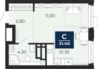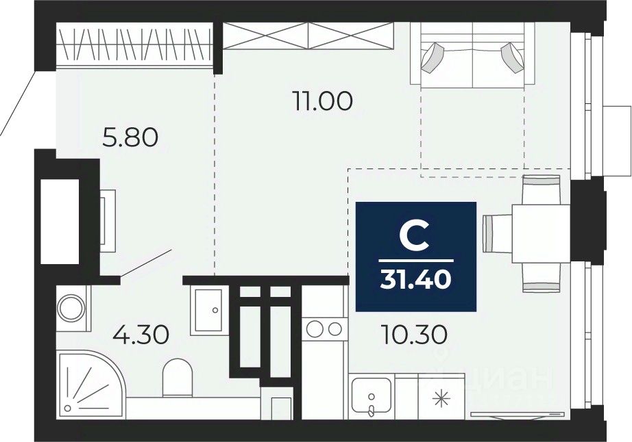 Продается однокомнатная квартира-студия от застройщика с предчистовой отделкой в ЖК "Айвазовский City" на 11 этаже. Общая площадь: 31.4 кв.м., площадь гостиной 21.3 кв.м., из которых 10.3 кв.м. выделено под кухонную зону. Все окна выходят на одну сторону. В квартире один совмещенный санузел. Высота потолков 2.7 м.
