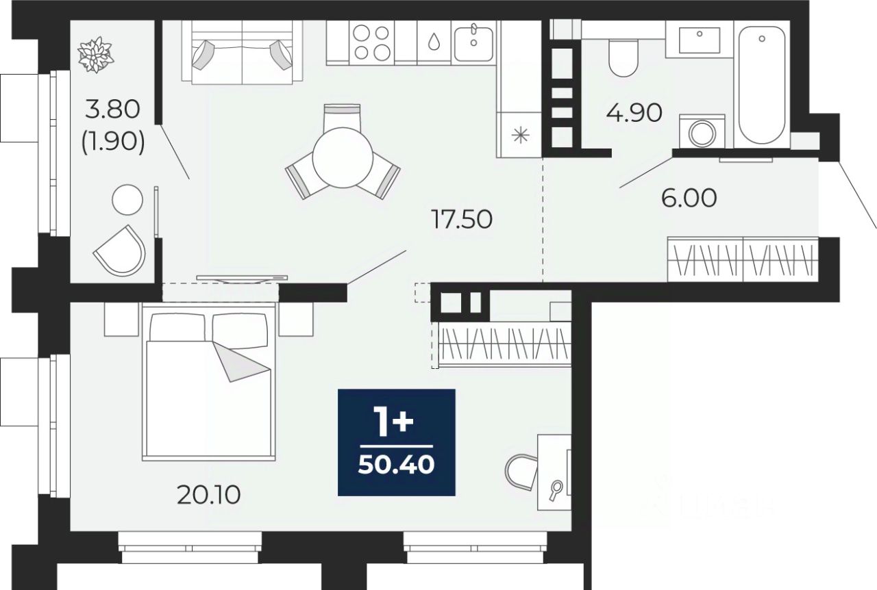 1-комн. квартира с предчистовой отделкой в ЖК "Айвазовский City" на 9 этаже. Общая площадь: 50.4 кв.м. Высота потолков 2.7 м.