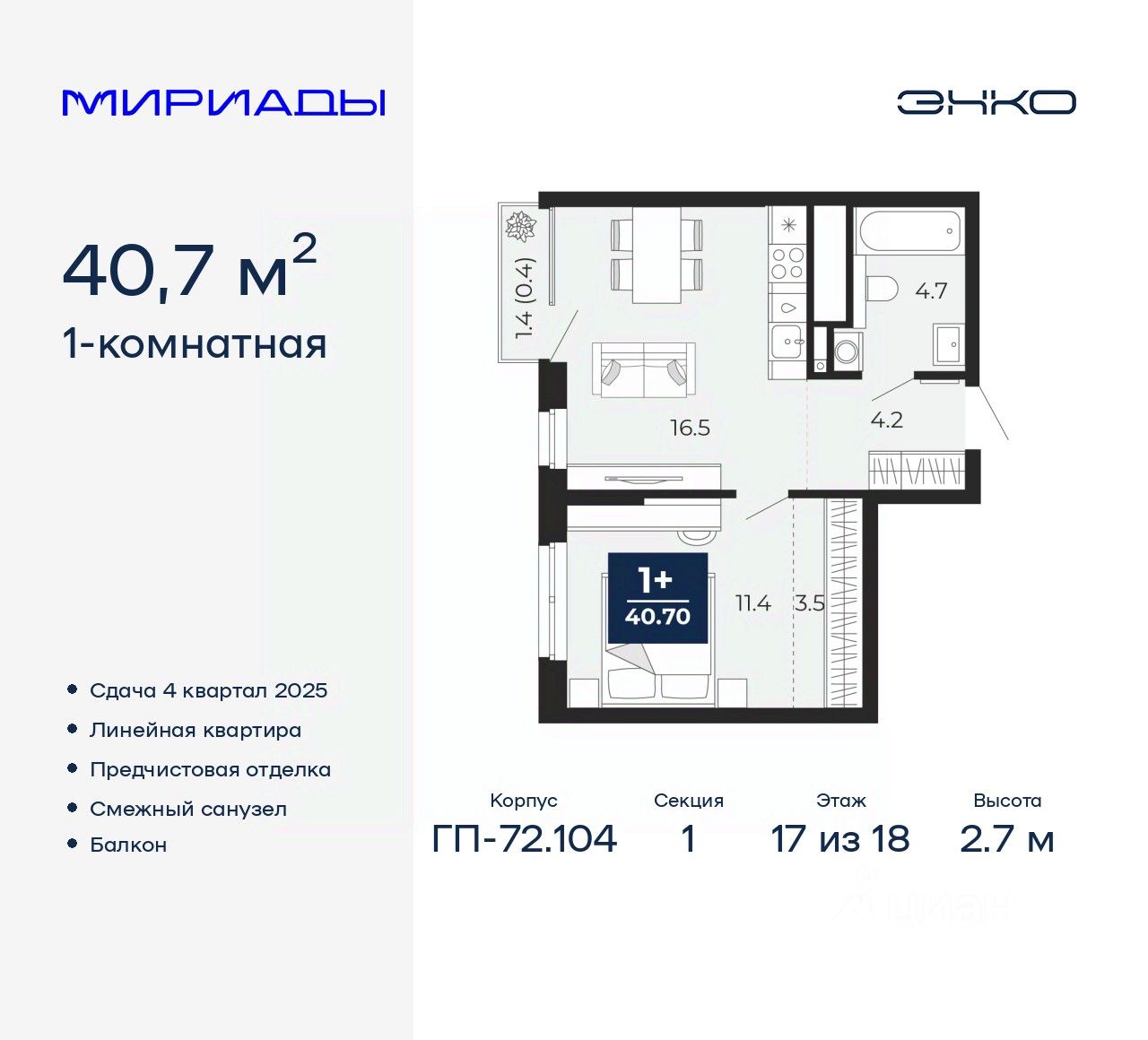 Просторная 1-комн. квартира с предчистовой отделкой в ЖК "Мириады" на 17 этаже. Общая площадь: 40.7 кв.м., жилая: 11.4 кв.м., площадь просторной кухни-столовой: 16.5 кв.м. Все окна выходят на одну сторону. В квартире один балкон, один совмещенный санузел. Высота потолков 2.7 м.