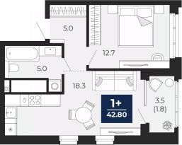 1-комн. квартира с предчистовой отделкой в ЖК "Мириады" на 11 этаже. Общая площадь: 42.8 кв.м., жилая: 12.9 кв.м., площадь просторной кухни-столовой: 16.1 кв.м. Все окна выходят на одну сторону. В квартире один балкон, один совмещенный санузел. Высота потолков 2.7 м.