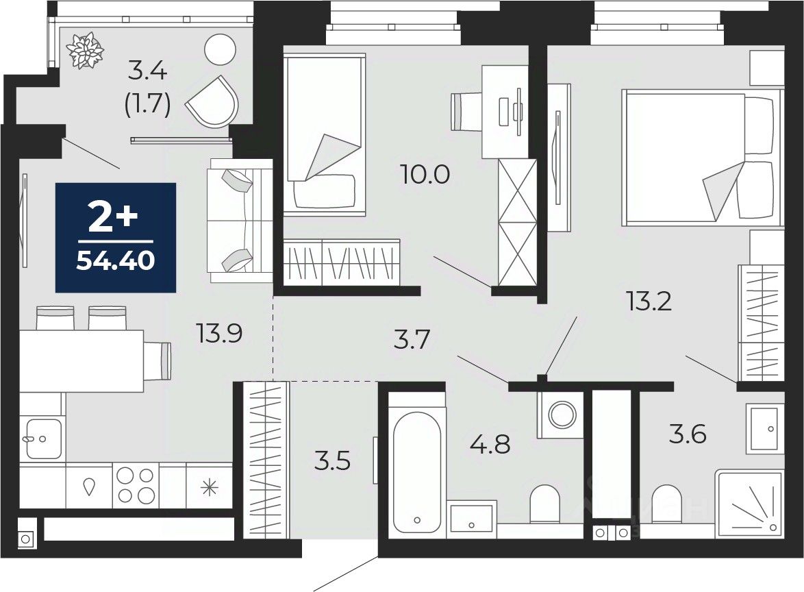Продается двухкомнатная квартира с предчистовой отделкой в ЖК "Мириады" на 11 этаже. Общая площадь: 54.4 кв.м., жилая: 23.2 кв.м., площадь просторной кухни-столовой: 13.9 кв.м. Комнаты изолированные, все окна выходят на одну сторону. В квартире два балкона и одна лоджия, один совмещенный санузел. Высота потолков 2.7 м.