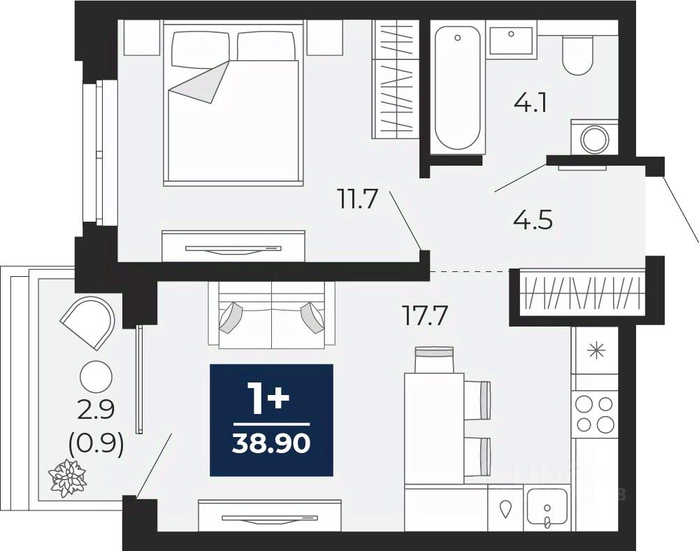 1-комн. квартира с предчистовой отделкой в ЖК "Мириады" на 13 этаже. Общая площадь: 38.9 кв.м., жилая: 11.7 кв.м., площадь просторной кухни-столовой: 17.7 кв.м. Все окна выходят на одну сторону. В квартире один балкон, один совмещенный санузел. Высота потолков 2.7 м.