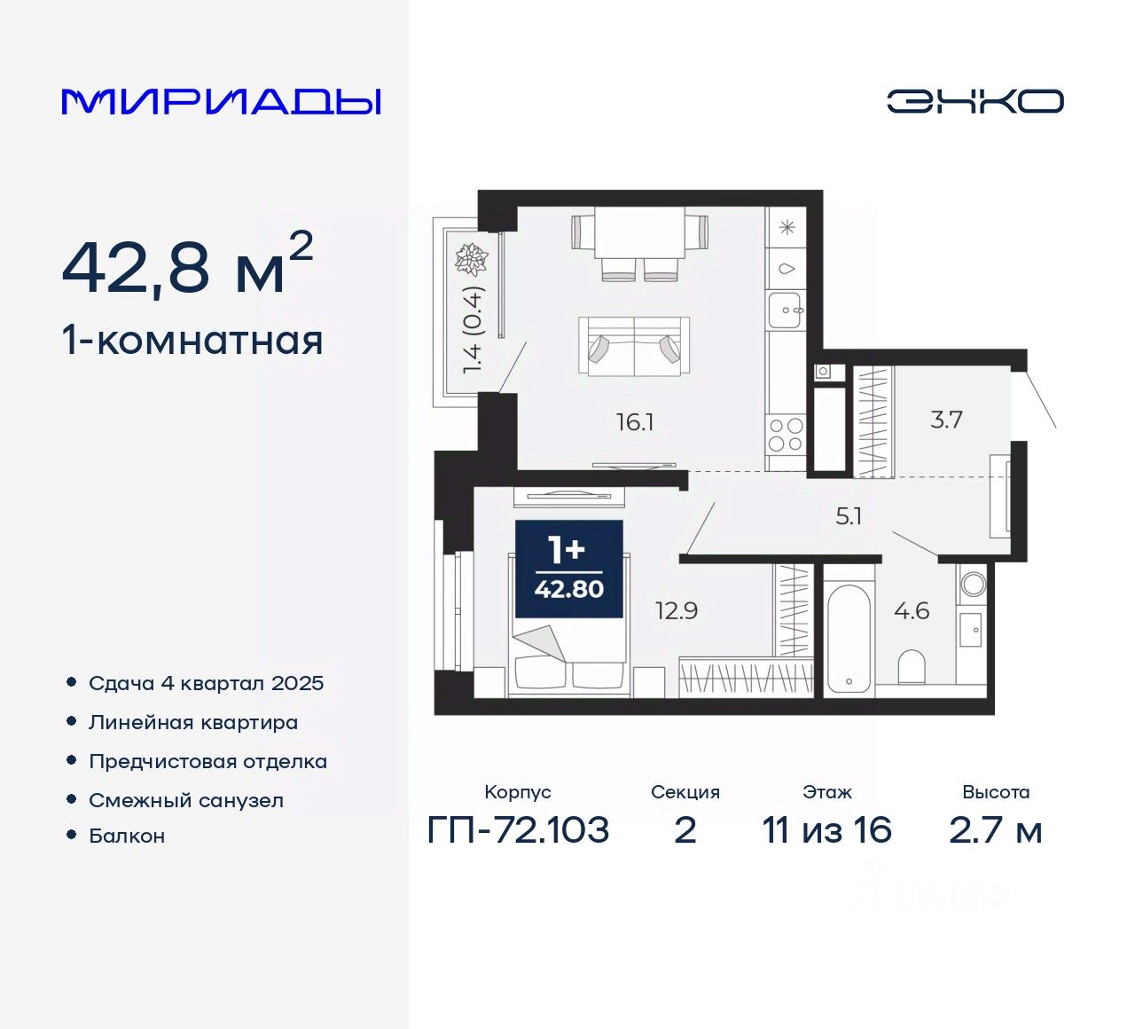 1-комн. квартира от застройщика с предчистовой отделкой в ЖК "Мириады" на 11 этаже. Общая площадь: 42.8 кв.м., жилая: 12.9 кв.м., площадь просторной кухни-столовой: 16.1 кв.м. Все окна выходят на одну сторону. В квартире один балкон, один совмещенный санузел. Высота потолков 2.7 м.