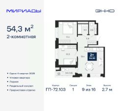 Двухкомнатная квартира с предчистовой отделкой в ЖК "Мириады" на 9 этаже. Общая площадь: 54.3 кв.м., жилая: 21.7 кв.м., площадь просторной кухни-столовой: 19.4 кв.м. Квартира угловая, очень светлая, естественная вентиляция при открытии окон. В квартире одна лоджия, один раздельный санузел. Высота потолков 2.7 м.