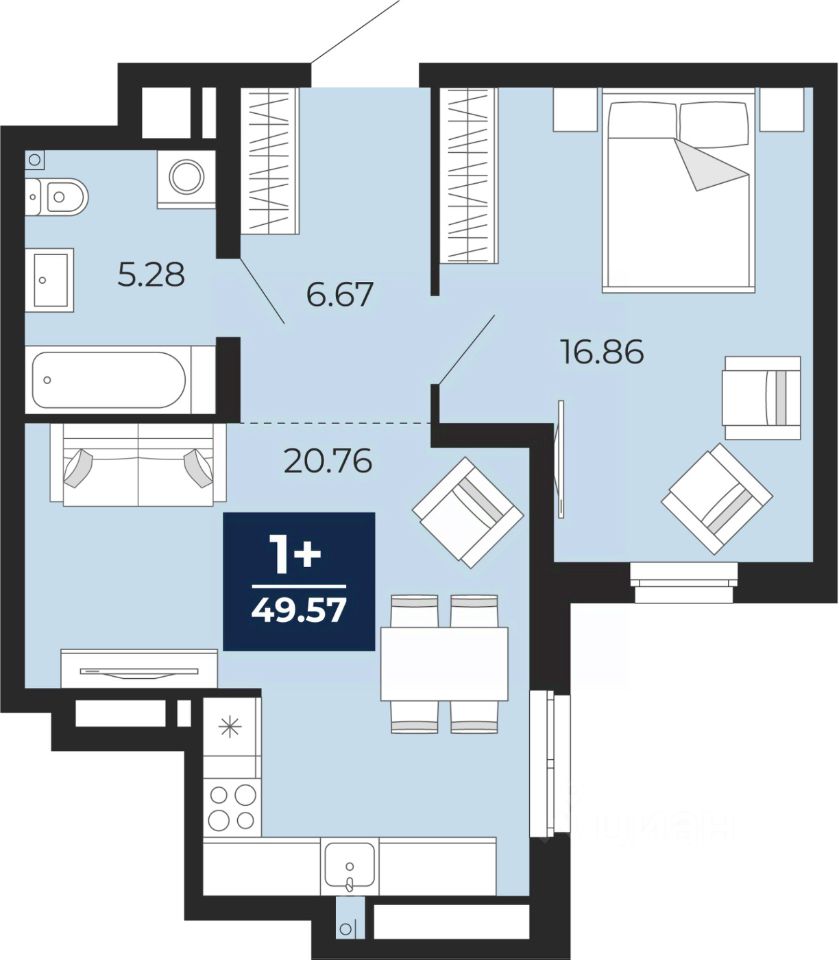 Однокомнатная квартира с предчистовой отделкой в ЖК "Айвазовский City" на 2 этаже. Общая площадь: 49.57 кв.м. Высота потолков 2.7 м.