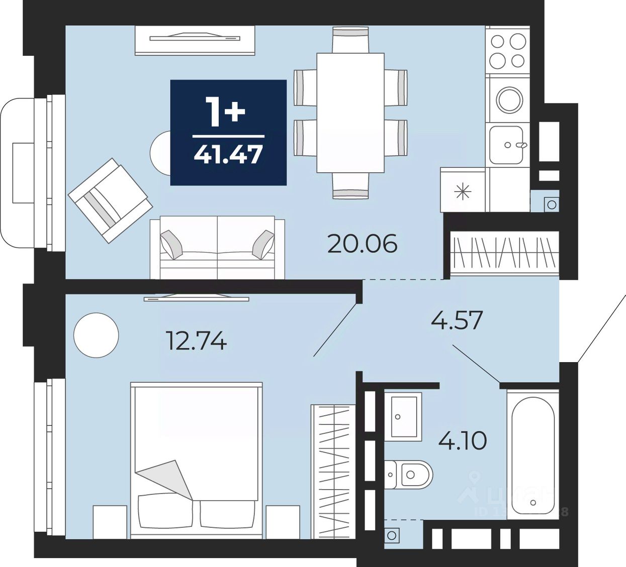 1-комн. квартира от застройщика с предчистовой отделкой в ЖК "Айвазовский City" на 3 этаже. Общая площадь: 41.47 кв.м. Высота потолков 2.7 м.