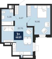 Просторная однокомнатная квартира с предчистовой отделкой в ЖК "Айвазовский City" на 8 этаже. Общая площадь: 49.57 кв.м. Высота потолков 2.7 м.