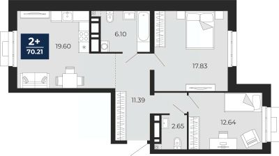 2-комн. квартира от застройщика с предчистовой отделкой в ЖК "Айвазовский City" на 3 этаже. Общая площадь: 70.21 кв.м. Высота потолков 2.7 м.