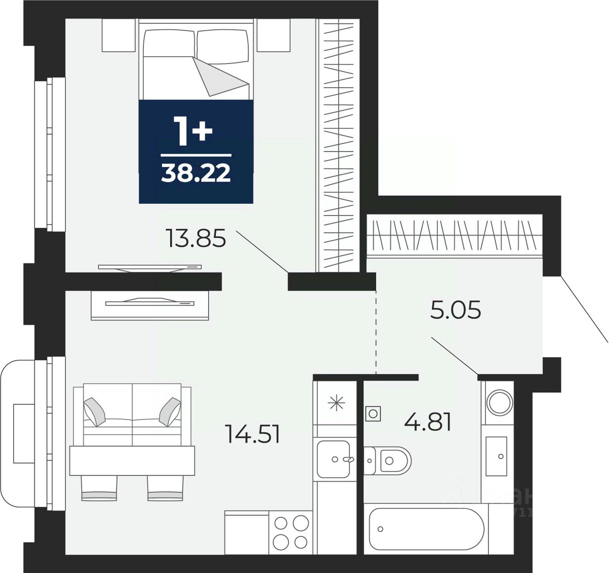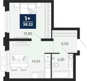 1-комн. квартира с предчистовой отделкой в ЖК "Айвазовский City" на 2 этаже. Общая площадь: 38.22 кв.м., жилая: 13.85 кв.м., площадь просторной кухни-столовой: 14.51 кв.м. Все окна выходят на одну сторону. В квартире один совмещенный санузел. Высота потолков 2.7 м.