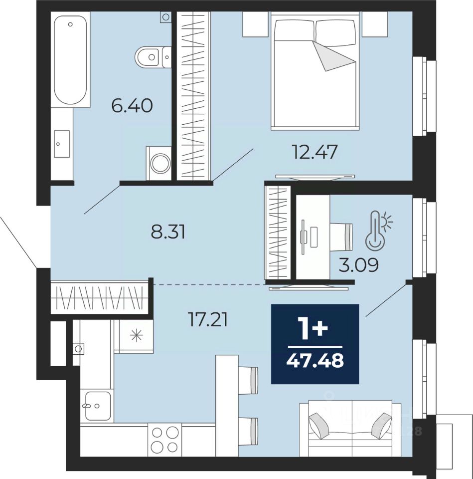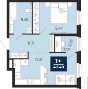 Однокомнатная квартира от застройщика с предчистовой отделкой в ЖК "Айвазовский City" на 2 этаже. Общая площадь: 47.48 кв.м., жилая: 12.47 кв.м., площадь просторной кухни-столовой: 17.21 кв.м. Все окна выходят на одну сторону. В квартире один совмещенный санузел. Высота потолков 2.7 м.