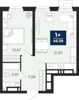 Просторная 1-комн. квартира с предчистовой отделкой в ЖК "Айвазовский City" на 7 этаже. Общая площадь: 46.59 кв.м., жилая: 13.47 кв.м., площадь просторной кухни-столовой: 21.87 кв.м. Все окна выходят на одну сторону. В квартире один совмещенный санузел. Высота потолков 2.7 м.