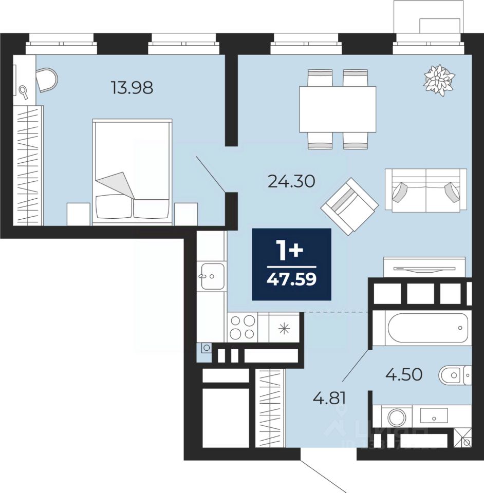 Однокомнатная квартира от застройщика с предчистовой отделкой в ЖК "Айвазовский City" на 3 этаже. Общая площадь: 47.59 кв.м., жилая: 13.98 кв.м., площадь просторной кухни-столовой: 24.3 кв.м. Все окна выходят на одну сторону. В квартире один совмещенный санузел. Высота потолков 2.7 м.