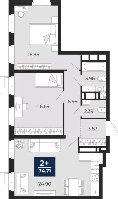 Просторная двухкомнатная квартира с предчистовой отделкой в ЖК "Айвазовский City" на 7 этаже. Общая площадь: 74.71 кв.м. Высота потолков 2.7 м.