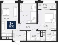 2-комн. квартира с предчистовой отделкой в ЖК "Айвазовский City" на 16 этаже. Общая площадь: 58.3 кв.м., жилая: 22.9 кв.м., площадь просторной кухни-столовой: 17.3 кв.м. Комнаты изолированные, все окна выходят на одну сторону. В квартире одна лоджия, два совмещенных санузла. Высота потолков 2.72 м.