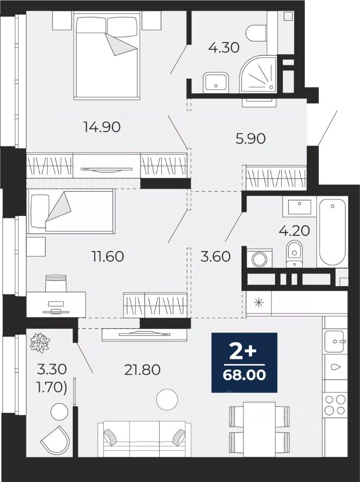 Продается двухкомнатная квартира от застройщика с предчистовой отделкой в ЖК "Айвазовский City" на 4 этаже. Общая площадь: 68 кв.м., жилая: 26.5 кв.м., площадь просторной кухни-столовой: 21.8 кв.м. Квартира угловая, окна oбecпeчивaют paвнoмepнoe ocвeщeниe в тeчeниe дня. В квартире одна лоджия, два совмещенных санузла. Высота потолков 2.7 м.