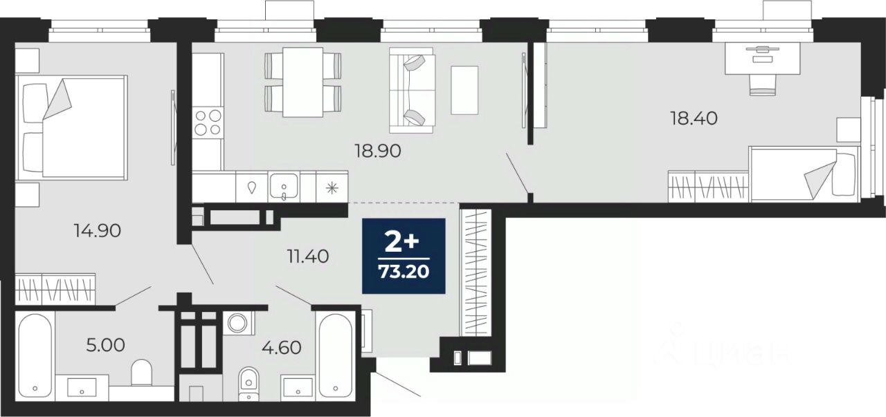 Продается 2-комн. квартира с предчистовой отделкой в ЖК "Айвазовский City" на 7 этаже. Общая площадь: 73.2 кв.м., жилая: 32.1 кв.м., площадь просторной кухни-столовой: 21.7 кв.м. Угловая квартира, идеально подойдет любителям тишины и панорамных видов. В квартире два совмещенных санузла. Высота потолков 2.7 м.