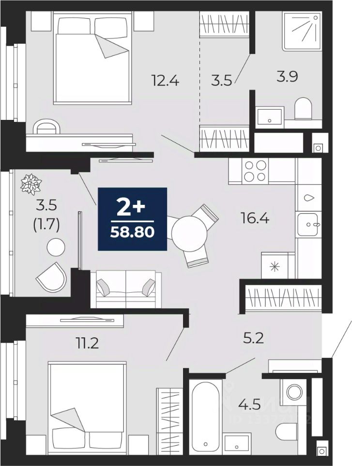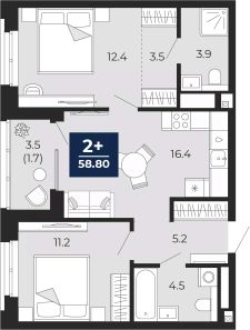 Продается 2-комн. квартира с предчистовой отделкой в ЖК "Мириады" на 7 этаже. Общая площадь: 58.8 кв.м., жилая: 23.6 кв.м., площадь просторной кухни-столовой: 16.4 кв.м. Комнаты изолированные, все окна выходят на одну сторону. В квартире одна лоджия, два совмещенных санузла. Высота потолков 2.7 м.