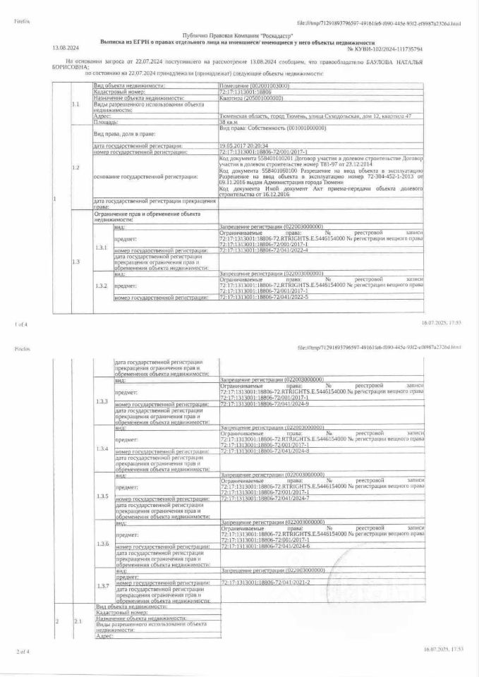 Должник: Баулова Н.Б., собственник: Баулова Н.Б. Лот: Жилое помещение (квартира), площадь 38 кв.м., кадастровый номер: 72:17:1313001:18806, г. Тюмень, ул. Суходольская, д. 12, кв. 47, (зарегистрированные лица - отсутствуют, задолженность за кап.ремонт на 17.07.25 - 1 700 руб.), н/ц: 4786435 р., з-к: 717966 р, код: 0001, рег. 72-009844;