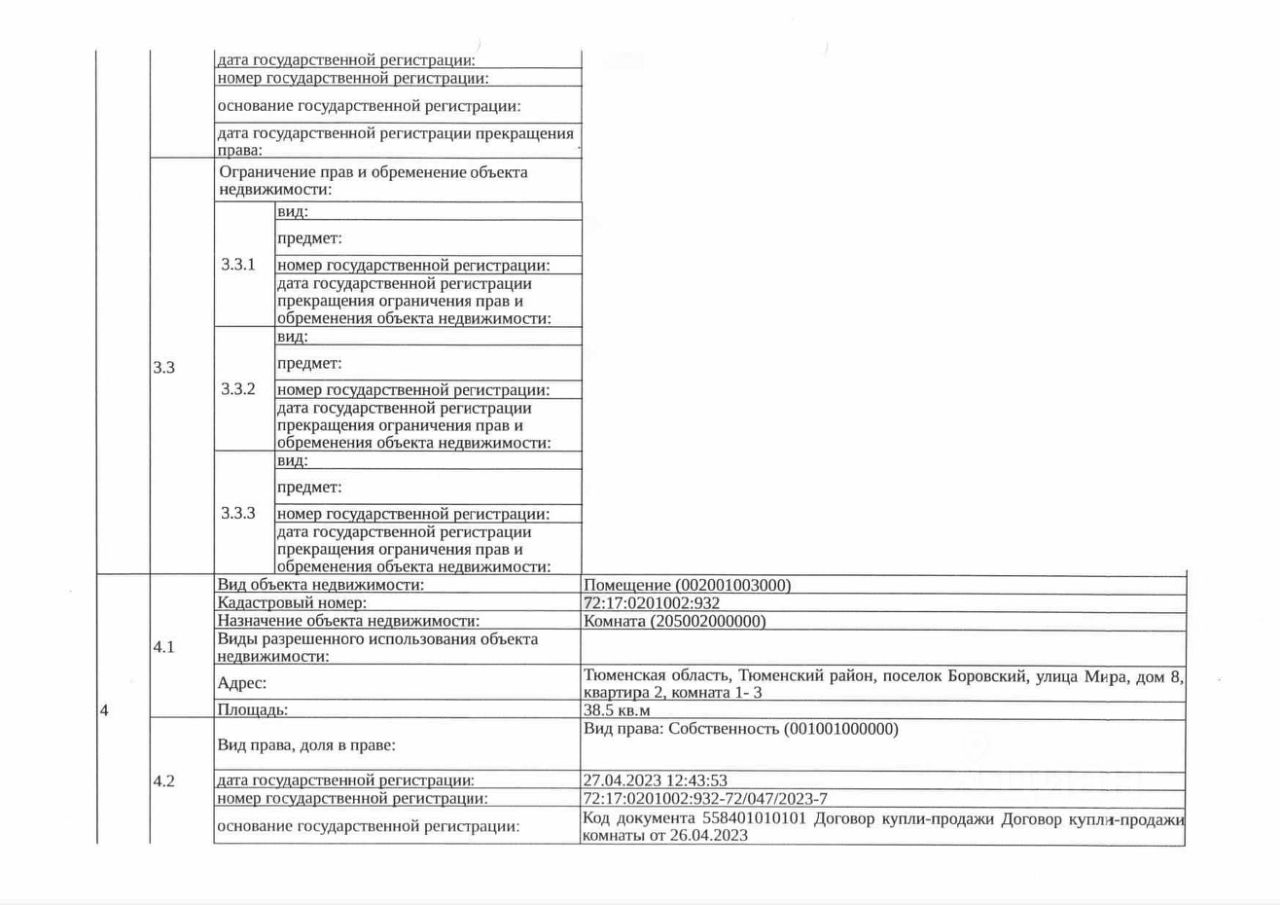 Должник: Оздамирова А.А., собственник: Оздамирова А.А. Лот: Жилое помещение (комната), площадь 38,5 кв.м., кадастровый номер: 72:17:0201002:932, р-н. Тюменский, рп. Боровский, ул Мира, д. 8, кв.2, комната 1-3 (зарегистрирован 1 взрослый, долг за кап.ремонт на 06.06.25 -10т.р.), н/ц: 1754400 р., з-к: 1754 р, код: 0014, рег. 72-010011;