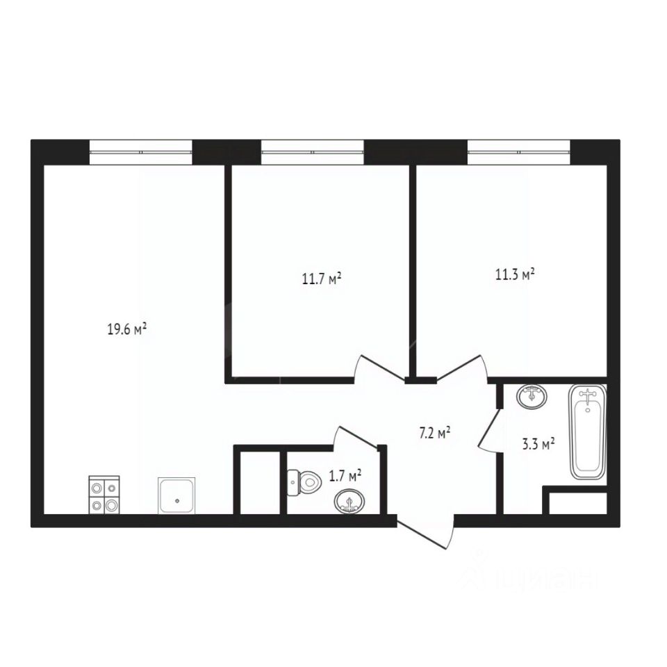 • Площадь: 58,5 м² (2 комнаты кухня-гостиная, санузел раздельный).
