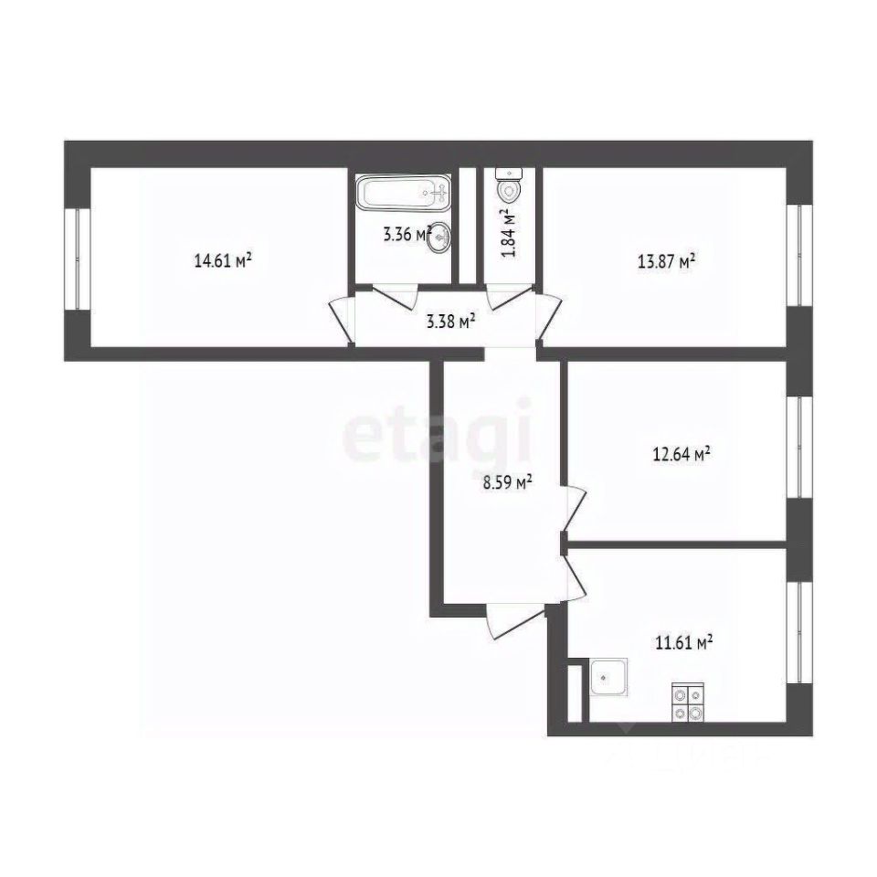 Трехкомнатная квартира площадью 69,8 кв.м расположена на третьем этаже четырехэтажного дома в селе Горьковка.