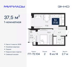 1-комн. квартира с предчистовой отделкой в ЖК "Мириады" на 6 этаже. Общая площадь: 37.5 кв.м., жилая: 10 кв.м., площадь просторной кухни-столовой: 17.8 кв.м. Все окна выходят на одну сторону. В квартире одна лоджия, один совмещенный санузел. Высота потолков 2.7 м.
